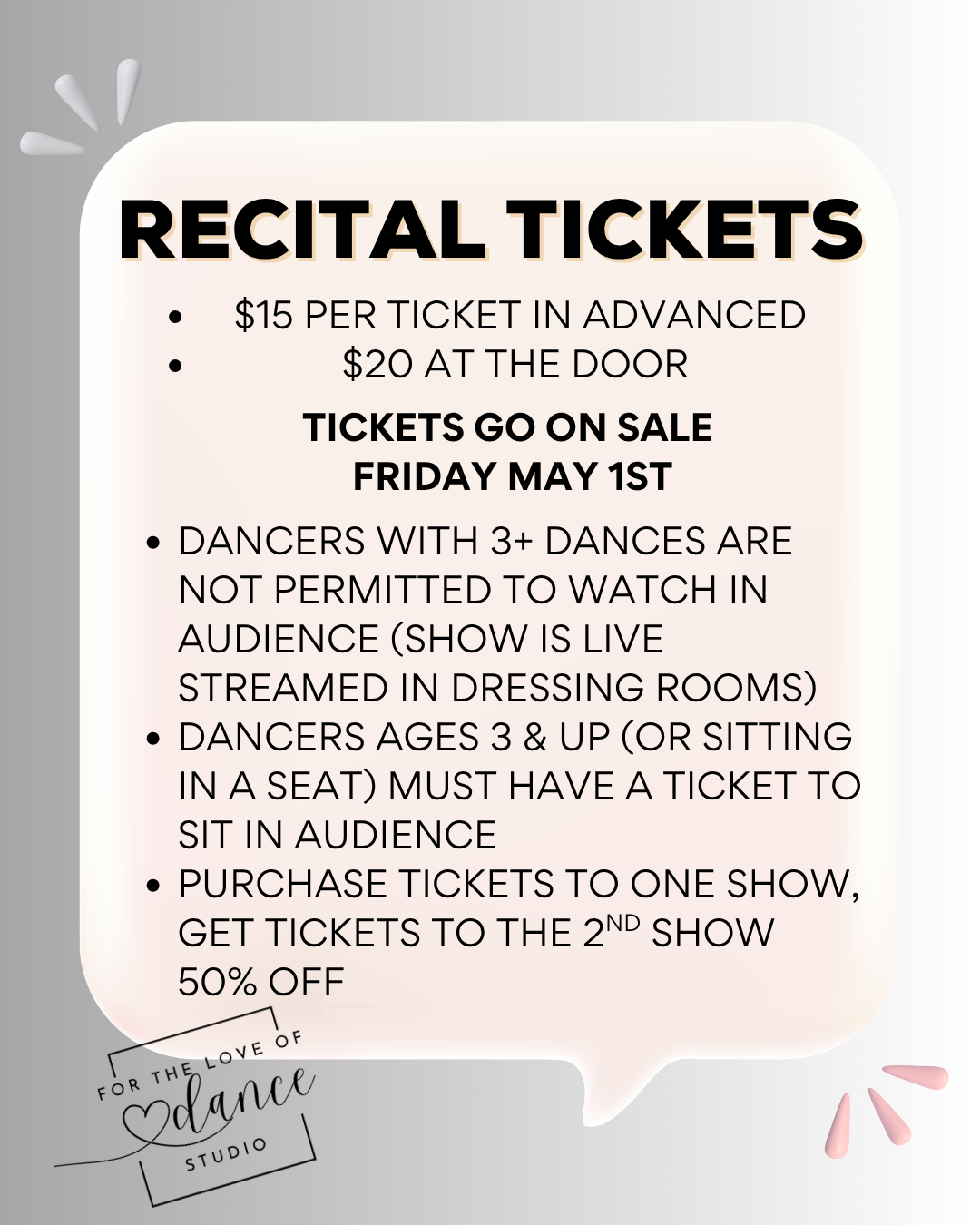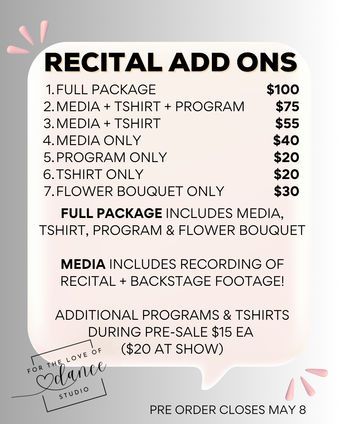 PRE-SALE FOR RECITAL ADD-ONS ARE AVAILABLE WITH YOUR TICKET PURCHASE STARTING MAY 1ST AND ENDS MAY 8TH.