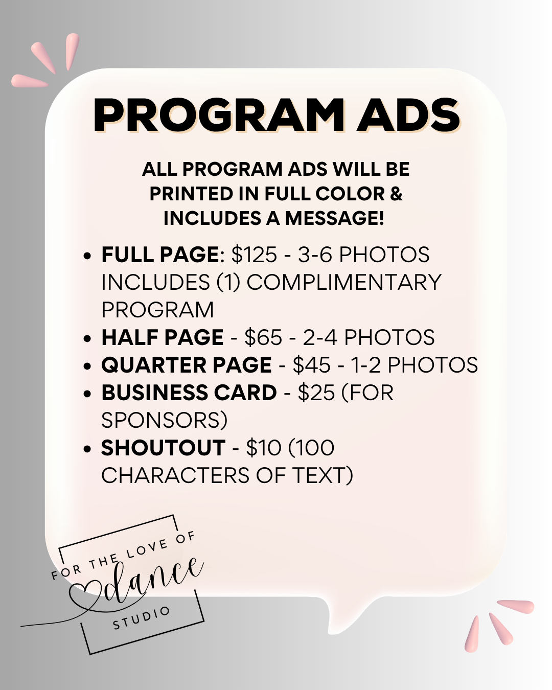 OUR PROGRAM WILL SERVE AS A YEARBOOK AND WILL INCLUDE GROUP DANCE PHOTOS, PHOTOS FROM SPECIAL EVENTS AND A SIGNATURE PAGE IN ADDITION TO YOUR PERSONAL AD FEATURING YOUR DANCER(S)!
