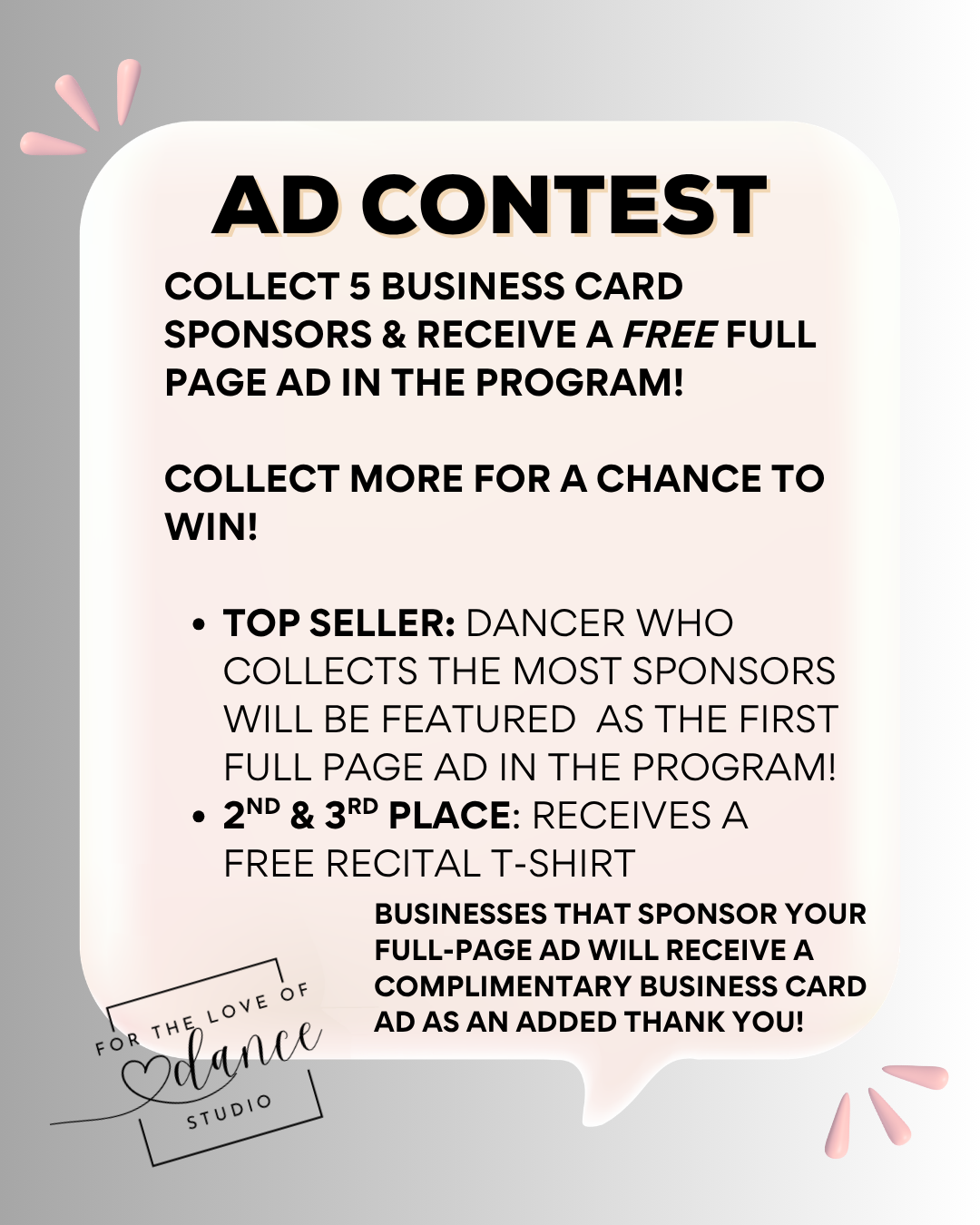 ANY BUSINESS THAT SPONSORS YOUR DANCERS FULL PAGE AD RECEIVES A COMPLIMENTARY BUSINESS CARD AD